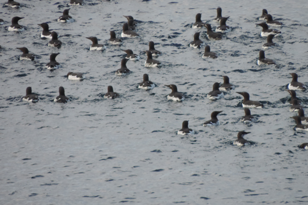 E noi cercavamo tra le migliaia di alche che volavano e sguazzavano, le rarità in cui speravamo. Non abbiamo visto alcuna Gazza marina minore (sarebbe stato una clamorosa botta di fortuna), ma abbiamo identificato quattro Urie di Brunnich, una delle quali alligna in questa foto, e potete divertirvi a cercarla (© Arturo Gargioni) | |