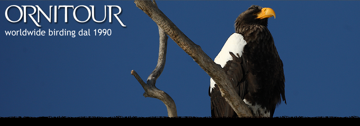 ![]() Il Fringuello roseo asiatico è una delle numerose specie di Fringillidi tipici delle regioni settentrionali dell'Asia Orientale; in Giappone è diffuso su Hionshu e Hokkaido (© Danilo Lombardi) ![]() Il Bulbul guancebrune è un quasi-endemismo del Giappone; oltre che nell'arcipelago nidifica solo a Taiwan e nelle Filippine (© Danilo Lombardi) ![]() Il Macaco del Giappone è anche conosciuto come Macaco facciarossa, e la fotografia qui sopra spiega bene il perché. Vedremo questa scimmia, endemica del Giappone, al Jigokudani Monkey Park, nei pressi di Nagano, dove potremo anche noi fotografare le abluzioni di questi primati, che si difendono dal gelo immergendosi nelle piscine naturali di acqua calda (© Yblieb, CC BY-SA 3.0) ![]() Il Giappone in inverno è il paradiso delle gru; nei campi di Arasaki, sull'isola di Kyushu, vedremo migliaia di bellissime ed eleganti Gru monache (© Alastair Rae, CC BY-SA 2.0)... ![]() ...e altrettanto splendide Gru nucabianca (© Alastair Rae, CC BY-SA 2.0) ![]() Due esemplari di Cervo sika, molto comune in Giappone (© Danilo Lombardi) ![]() Dopo le due specie di gru du Kyushu, l'apoteosi "gruologica" avrà luogo sull'isola di Hokkaido, dove assisteremo ai voli e alle danze delle meravigliose Gru della Manciuria (© Danilo Lombardi) ![]() Entrambe le specie di cigni nordici svernano in Giappone, il Cigno selvatico e il Cigno minore (illustrato nella foto); o meglio tutte le tre specie, poiché il Cigno minore è stato splittato in Cigno fischiatore (nidificante in Nordamerica e Chukotka) e Cigno di Bewick, nidificante in Siberia. Identificare le due specie non sarà per niente facile, ma ci proveremo (© Danilo Lombardi) ![]() Sono almeno dieci le specie di anatre rare (almeno per noi europei) che potremo vedere in Giappone; splendori come l'Alzavola del Bajkal, l'Anatra falcata, l'Anatra mandarina, lo Smergo squamato e il Germano beccomacchiato orientale sono osservate regolarmente; la Moretta arlecchino, forse la meno rara per noi, è probabilmente la più bella di tutte (© Danilo Lombardi) ![]() Solo in Giappone si poteva scattare questa fotografia. La pur grossa Aquila di mare sembra una poiana di fronte all'imponenza dell'Aquila di mare di Steller! (© Danilo Lombardi) ![]() Il Gufo pescatore di Blakiston è una specie vulnerabile, il cui areale è limitato all'estremità nord-orientale dell'Asia. In Giappone vive solo a Hokkaido e sarà un privilegio vedere questo splendido gufo cacciare nella notte (© Danilo Lombardi) |